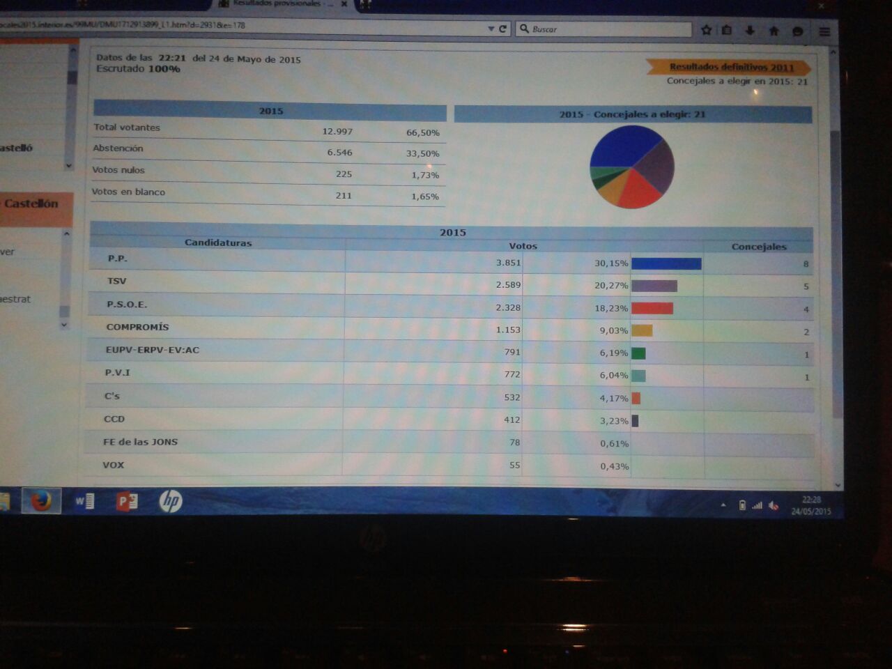 El PVI logra únicamente una sola representante, María Dolores Miralles. La izquierda gana las elecciones, Tots i Totes da el sorpasso a los Socialistas y se sitúan delante de ellos, con lo que Enric Pla se convierte en el único alcalde de Podemos en la Comunidad Valenciana, luego de lograr el apoyo de los Socialistas y de Compromís, al que el PVI fue invitado a sumarse, rechazándolo nuestra asamblea general principalmente, por no ser necesarios, pero también ante el desconocimiento del rumbo político que esta amalgama de formaciones iba a decidi